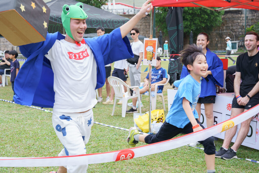 5歳~中学生までが参加できる借り物競争。「ボールペン」「帽子をかぶっている人」など様々なお題が飛び交う中、息子が引いたのは「ともだち」。会場にいる自分のともだちはみんな競技参加中で見つからずオロオロ…そんな中、同じチームの陽気なリーダーが「俺たち、ともだちだろ!」と名乗り出てくれ、1位でゴール!やったね!